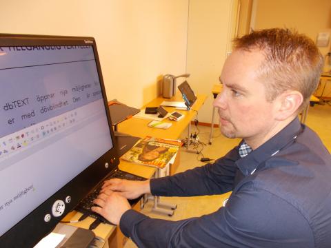 Rätt hjälpmedel är ofta A och O för att kunna jobba eller plugga som synskadad. Marcus Eriksson från Polarprint visar förstoringskameran Clearview med delad skärm: du kan ha bild från kamera och dator samtidigt.