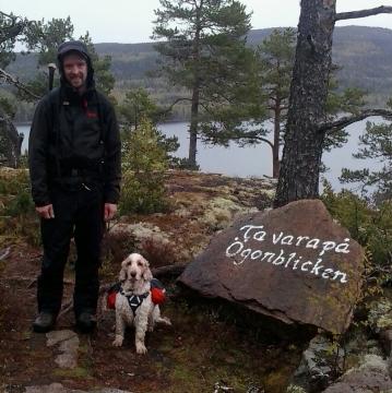 Nya kanslisten på SRF Västernorrlands kansli i Härnösand, Fredrik Lundström, 45, är en friluftsmänniska som ofta är ute med sin hund Eddie, som här på Högakustenleden. Foto: Lena Näslund