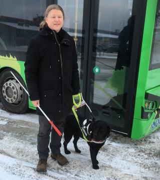 ”Det kom något gott ur det här”, säger gravt synskadade Torbjörn Ruther efter mötet där han bad bussförarna att vara uppmärksamma på människor med vit käpp och ledarhund. Foto: Göran Nyström