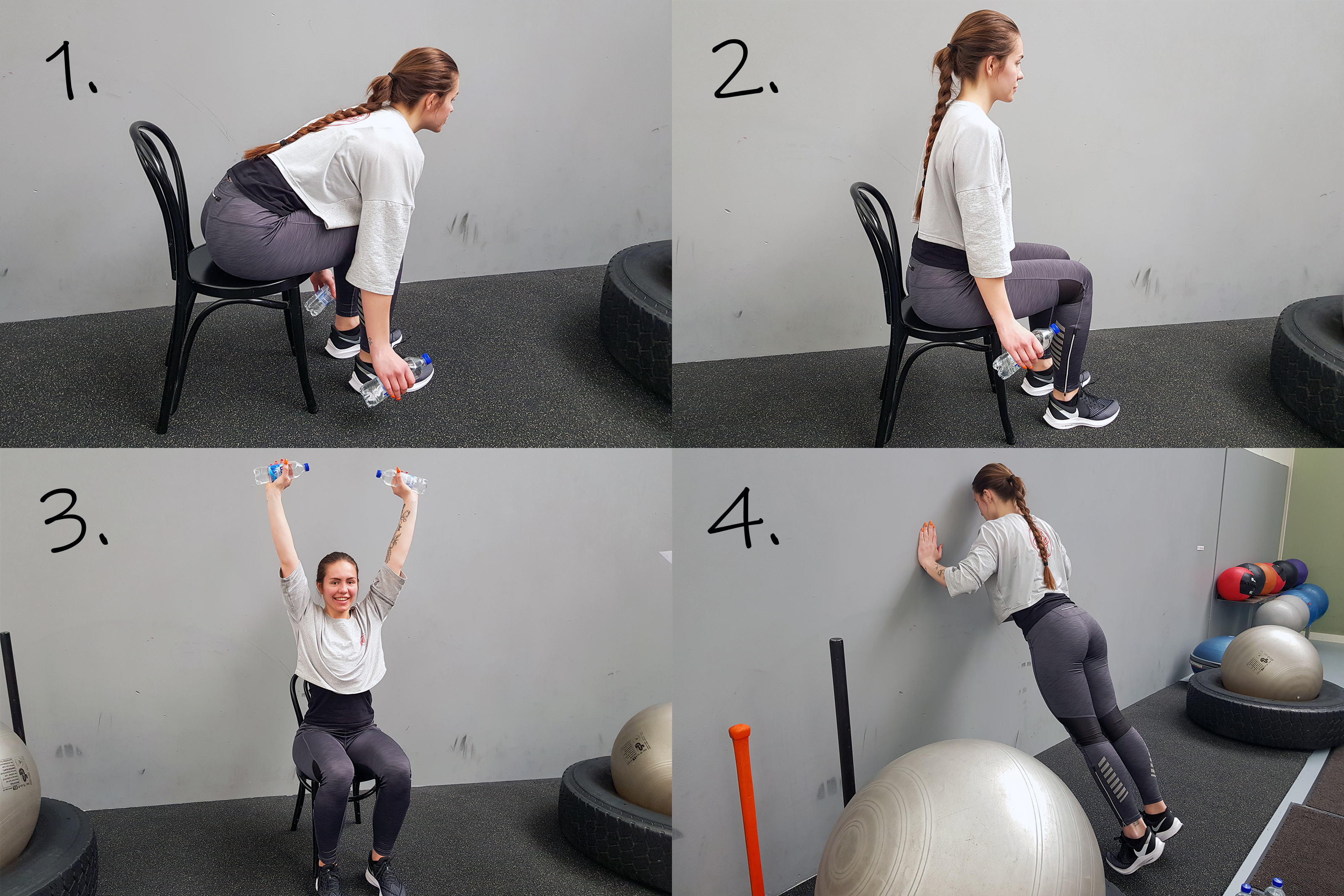 Enkla styrkeövningar hemmavid 2020-06-02 Del 2 i serien om hemmagympa eller seniorgympa med Agneta Bergqvist vid Friskis&Svettis i Sundsvall. På bilden:Erica Bergqvist illustrerar 4 st av övningarna. https://taltidningenvasternorrland.se/wp-content/uploads/2020/06/2020v23_05del-2-styrka-seniorgympa.mp3
