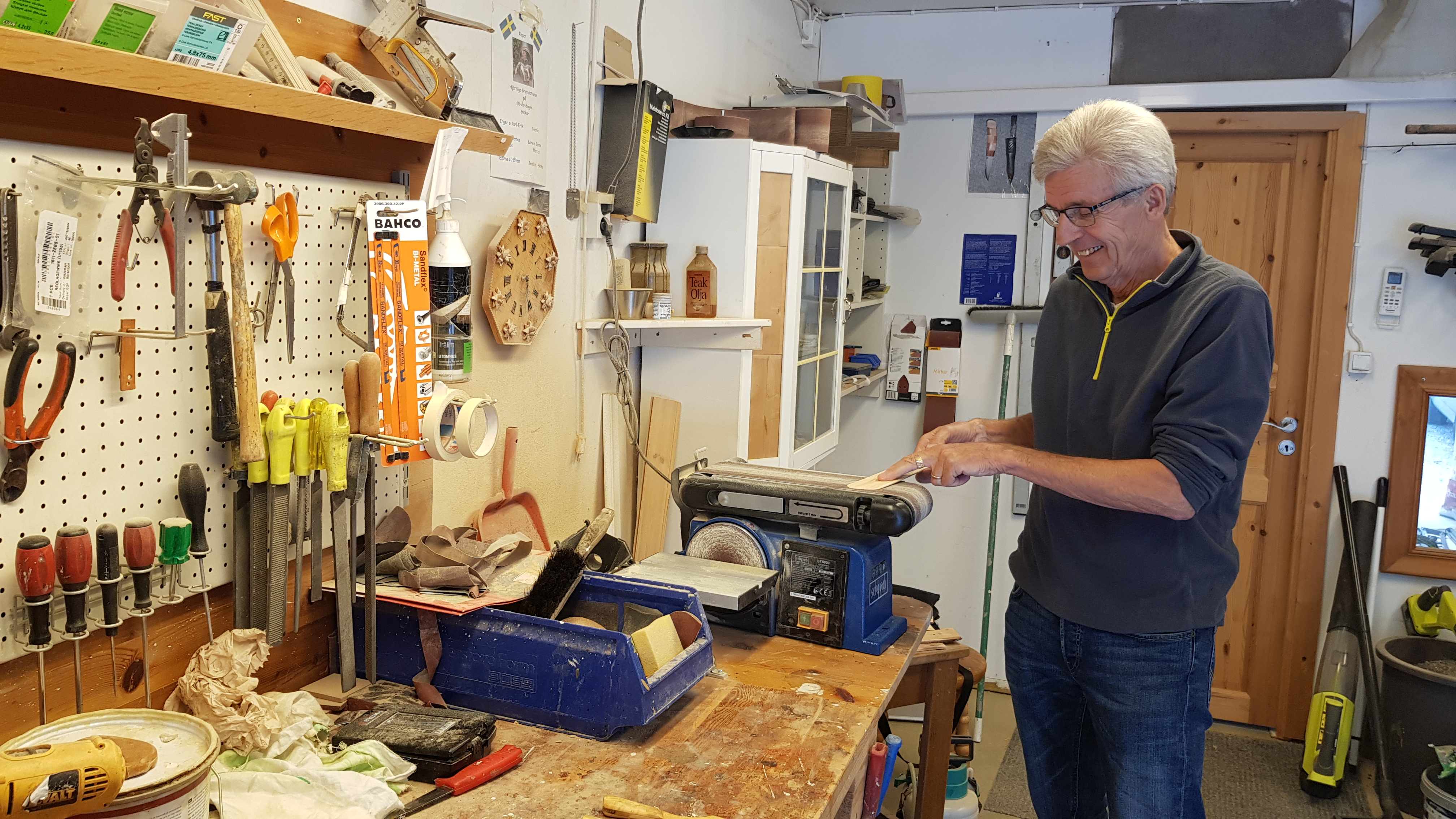 Roger Johansson,73, i Matfors fann slöjdandet som terapi efter beskedet om sin synskada. Idag är han fortfarande aktiv knivmakare och slöjdare och har utökat sitt sortiment. – Coronapandemin har lett till att jag oftare tillbringar min tid i snickarboa, säger Roger till Spotlight.
