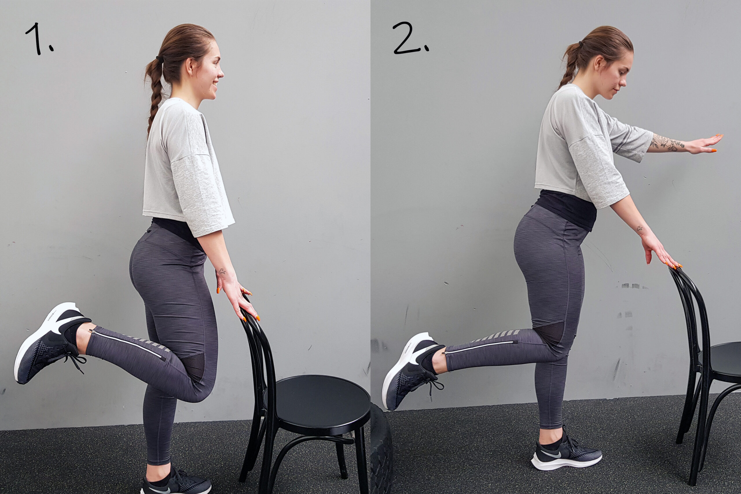 Hemmagympa har blivit populärt. Agneta Bergqvist vid Friskis och Svettis i Sundsvall instruerar hur vi kan göra enkla övningar för att träna kondition och balans. Syntolkning: På bilden ser vi Erica Bergqvist som gör 2 balansövningar med hjälp av en stol.