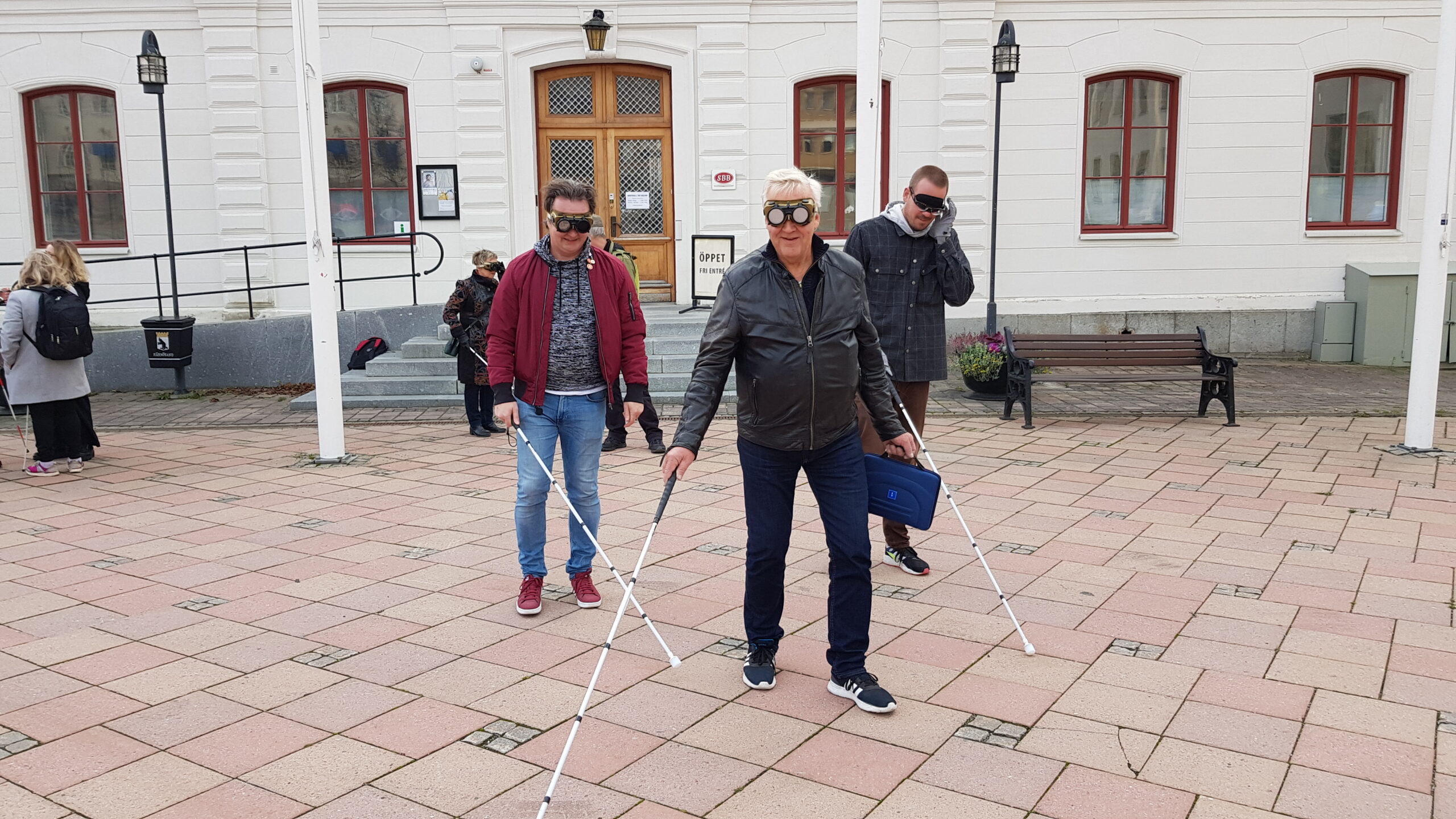 Kommunstyrelsen i Härnösand har tagit beslutet att Samhällsnämnden tillsammans med Tillgänglighetsrådet nu ska starta ett projekt för att anpassa utomhusmiljön och göra den bättre för funktionshindrade. På bilden politiker med ögonbindel och vita käppen på torget i Härnösand. I mitten: Ingemar Wiklander, KD, till vänster Carl-Fredrik Edgren, V och till höger Johan Sundqvist, MP.