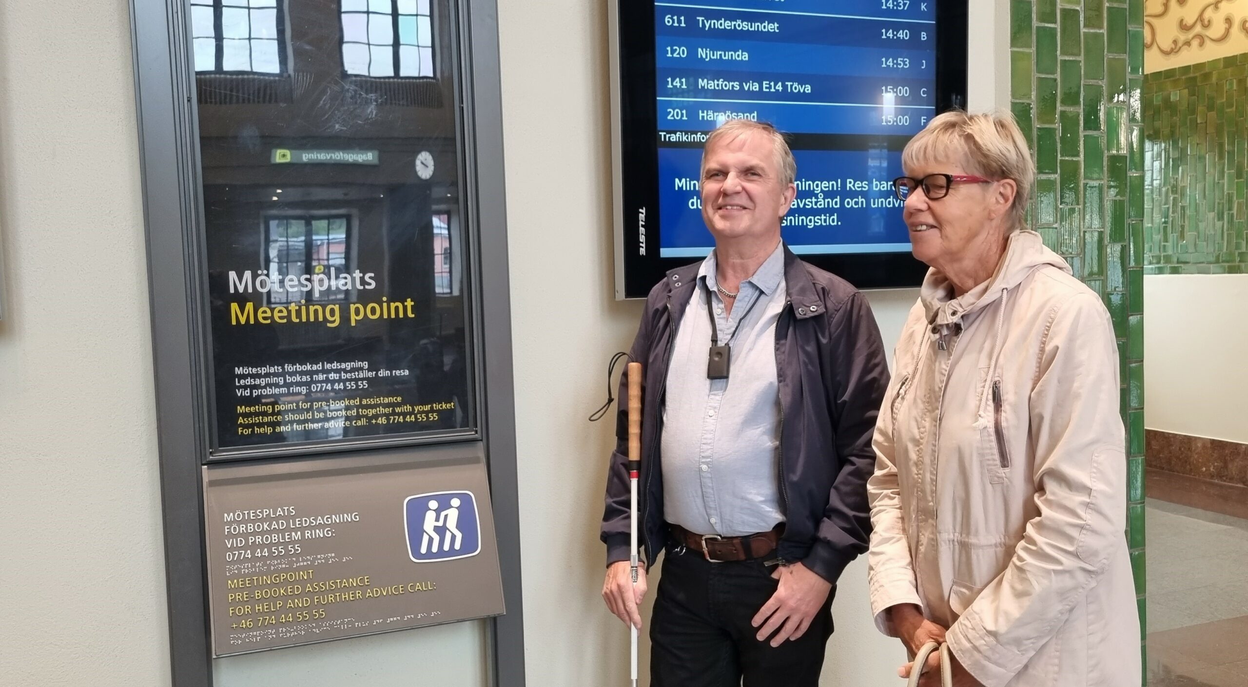 -Det behövs en sittplats vid mötesplatsen för förbokad ledsagning. Det är svårt att ”käppa” sig fram med vita käppen med hjälp av det taktila ledstråket i nya Resecentrum, säger Leif Fundin som är blind och hörselskadad. Marie-Louise Ekström, som är synsvag, tycker att kontrasterna i hela resecentrum är bra och att den taktila informationskartan är tydlig och fungerar.