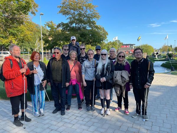 Med hjälp av syntolkning och en coach fick äldre och yngre synskadade tillsammans testa att spela äventyrsgolf i Örnsköldsvik. – Svårast är att anpassa slaget och puttens kraft utifrån banans hinder, tycker både Alvar Linder,80, och Sofia Boström,18 år. Foto SRF Västernorrland