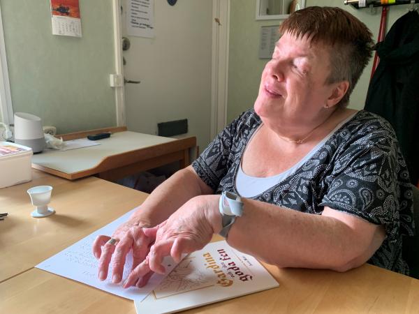 Gravt synskadade Anita Mäki, 65, i Luleå, debuterar nu som barnboksförfattare. Hon formulerar tankar till ord hur det är att vara synskadad i en sagovärld. Foto Eva-Marie Svensson