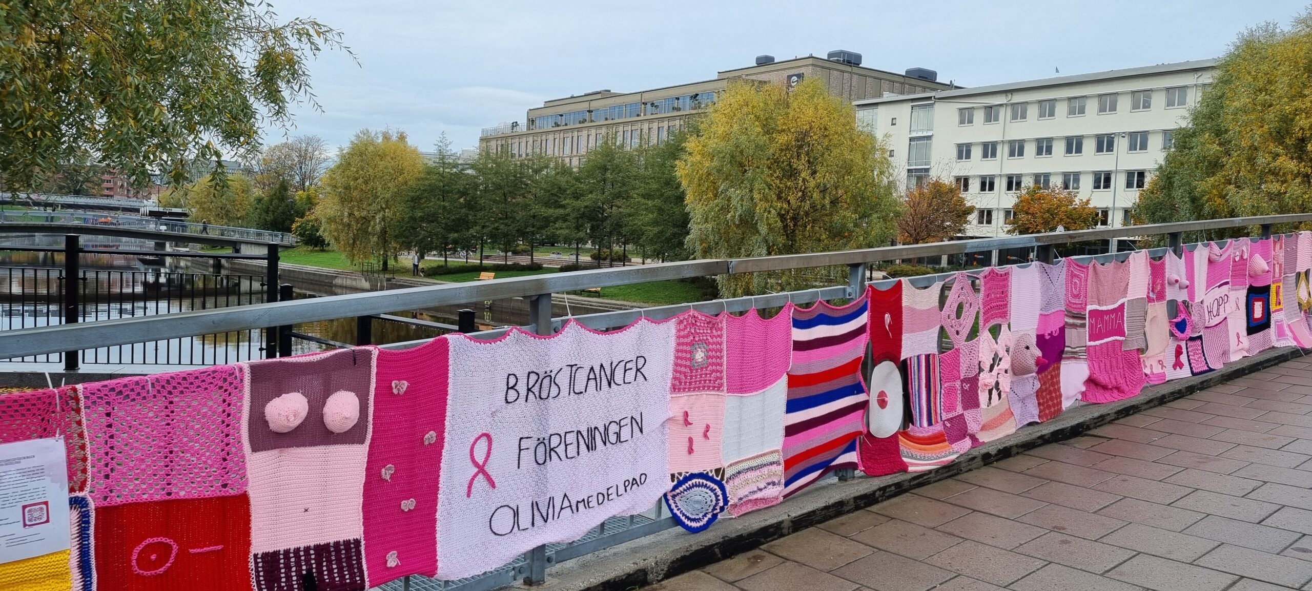 Oktober är månaden då bröstcancer speciellt uppmärksammas. Puckelbron över Selångersån i Sundsvall har dekorerats med 15 meter rosa rutor med gorillamönster i olika material för att göra oss påminda om sjukdomen och stötta Medelpads bröstcancerförening Olivia.