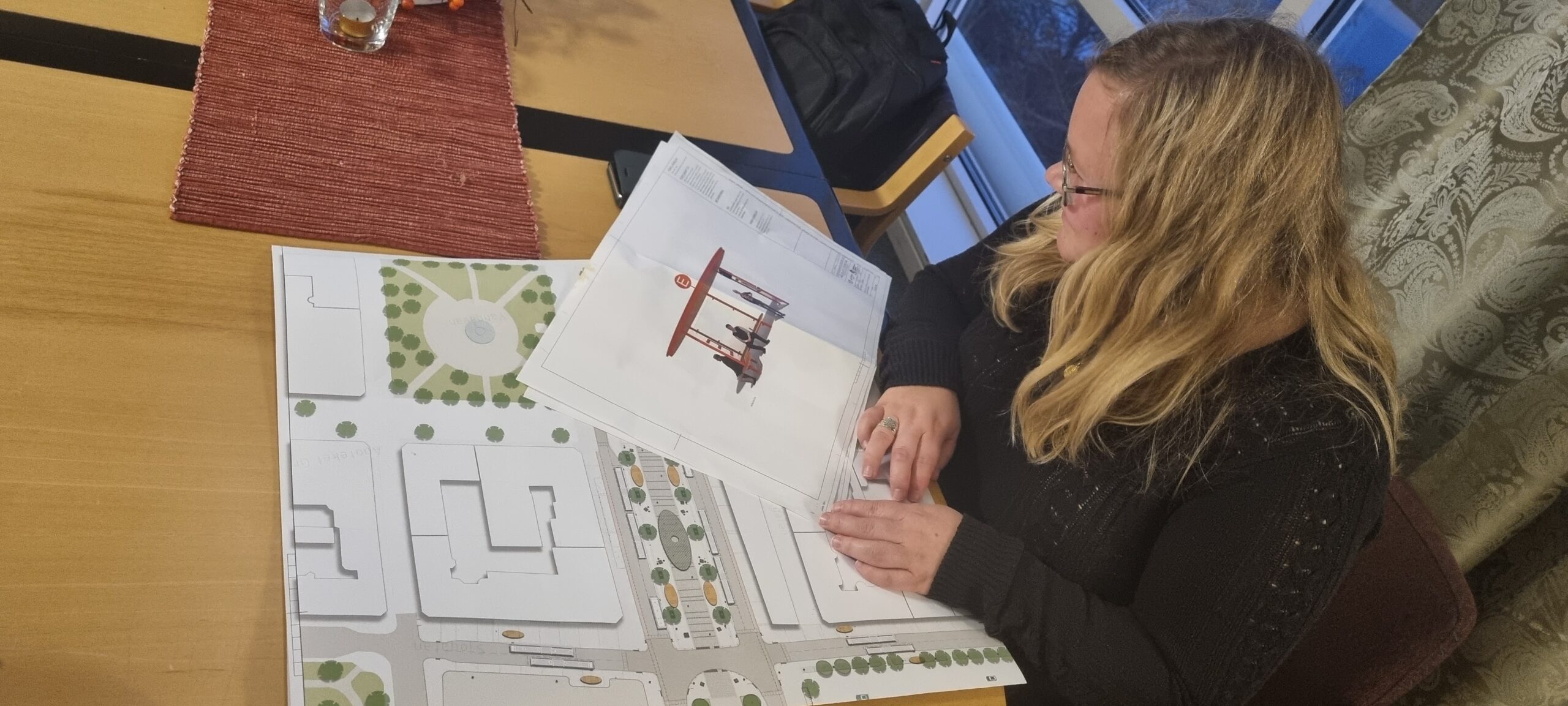 Frida Karlander är ombudsman för SRF Västernorrland. Hon studerar här kartor över de nya busshållplatserna i centrala Sundsvall som just nu håller på att utformas. Sundsvalls kommun har tacksamt tagit emot synpunkter på utformningen.