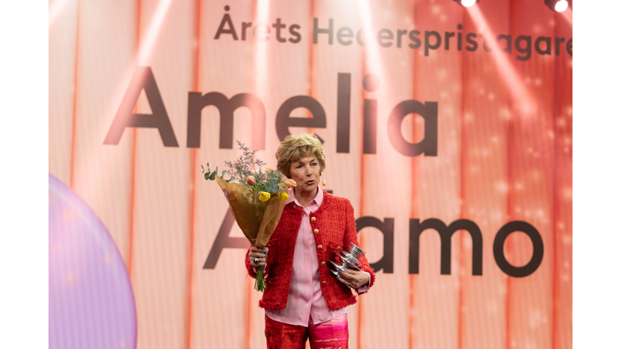 Den prisbelönta journalisten och publicisten Amelia Adamo,75, prisas för sitt mångåriga arbete med att lyfta ljudboken i olika sammanhang, bland annat genom att se till att ljudböcker recenseras i tidningar. Hederspriset delades ut under Storytel Awards-galan den 31 mars. Foto Joey Dahl/Storytel
