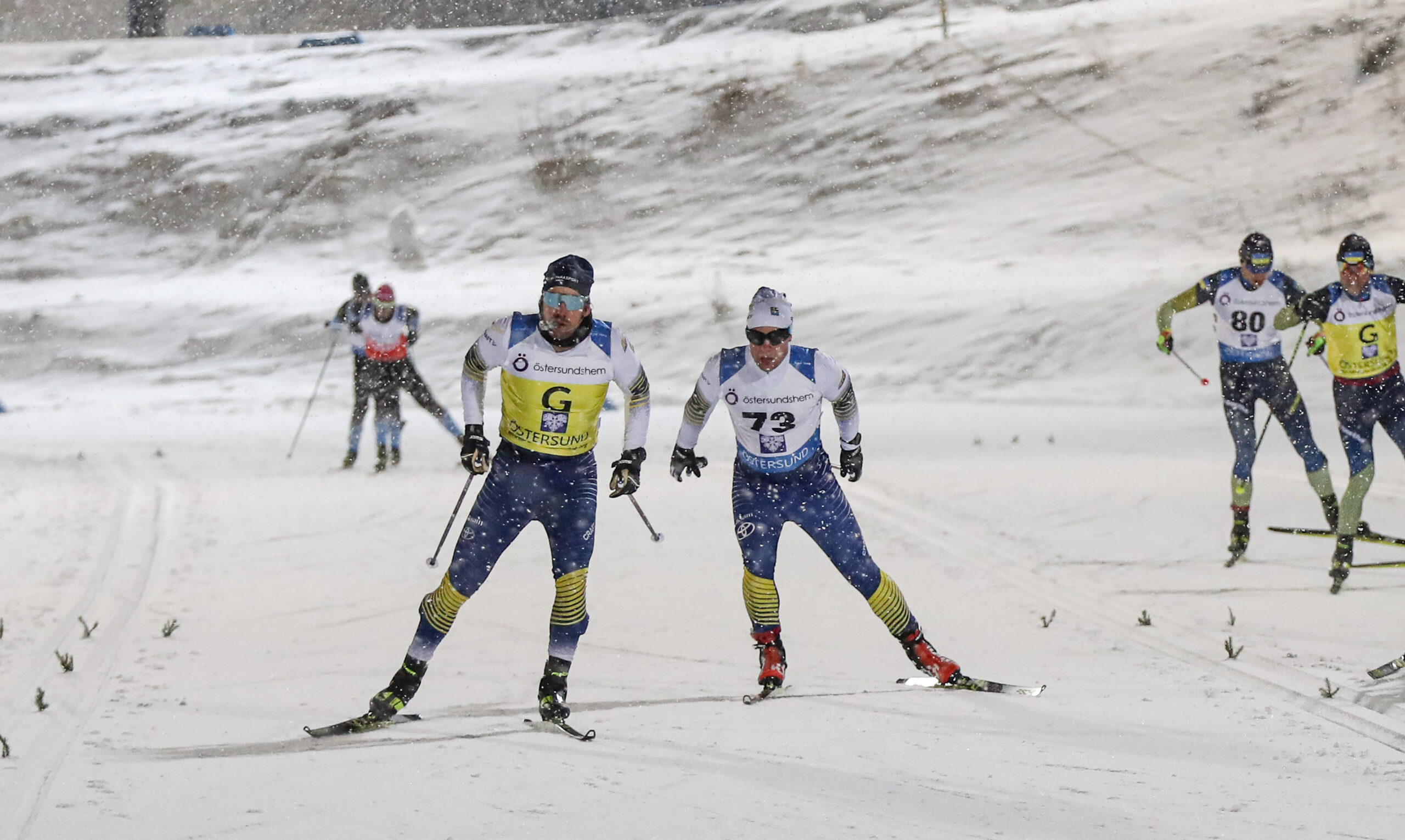 Zebastian Modin är synskadad och är en av dem som är uttagen till den svenska truppen i Paralympiska Vinterspelen 2022 i Peking. På bilden sprintar han mot mål tillsammans med sin guide Emil Jönsson Haag. Foto Karl Nilsson/ Parasport Sverige