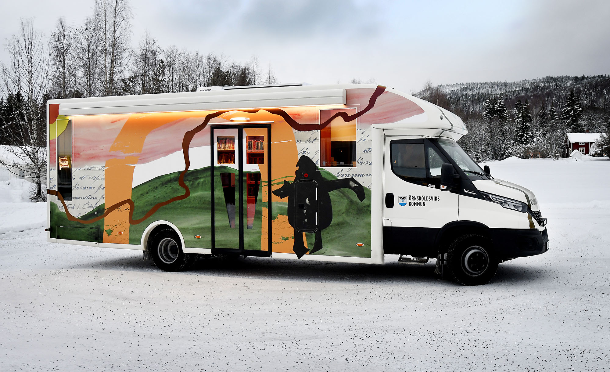 Nu har Örnsköldsviks kommuns nya biblioteksbuss börjat rulla på vägarna i kommunen. Två gånger i veckan besöker bibliotekspersonal skolor och andra kommun innevånare. Foto: Arkenbiblioteket/Örnsköldsviks kommun