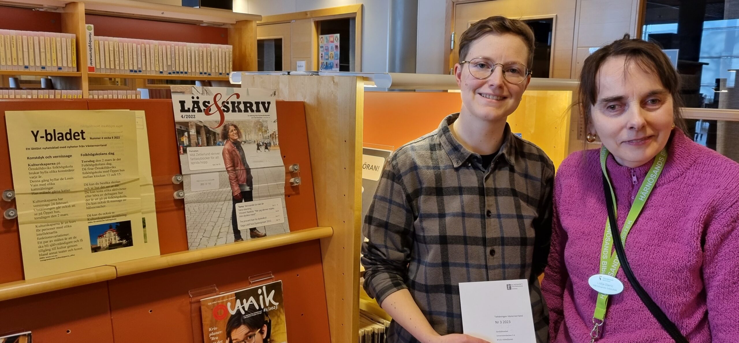 Karin Jonsson Sandström och Lidija Djerec arbetar vid Härnösands bibliotek. De har tillsammans med Tillgänglighetsgruppen ställt iordning en hylla för broschyrer och tidskrifter att läsa på olika sätt. Den 30 mars äger invigningen rum och allmänheten hälsas välkommen.