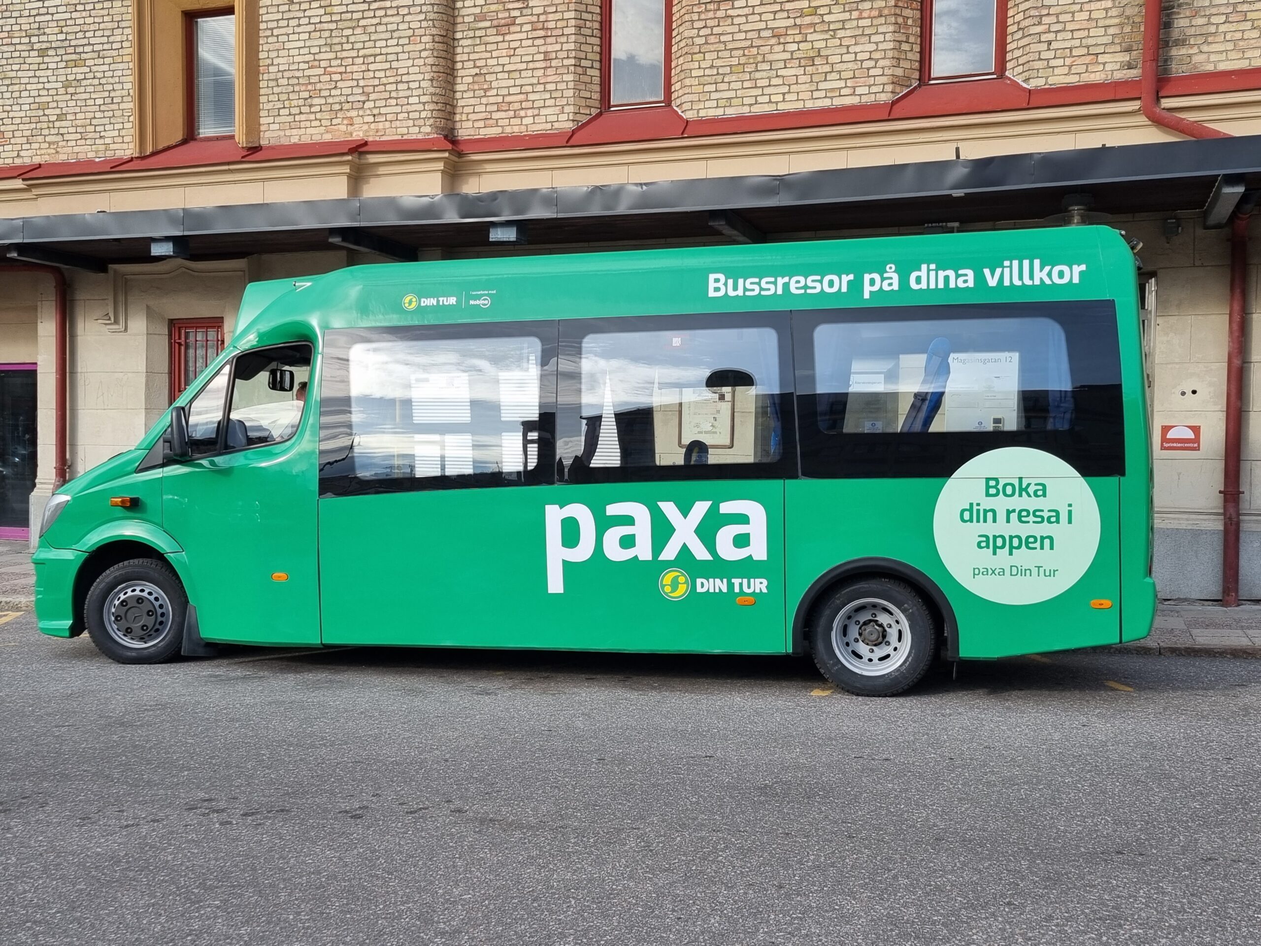 PaxaDinTur är ett försöksprojekt i Sundsvall under ett år som ska utvärderas i september 2024. Resenären bokar sin busstur, bestämmer när och vart bussen ska komma. Bokningen kan ske i Paxa appen, som är synskadeanpassad. Resenären kan också ringa kundcenter och boka sin tur.